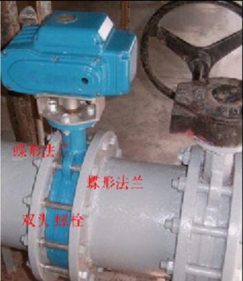 接下來的這個圖片就是對夾蝶閥的一個安裝示意圖。這上面很明白的產(chǎn)品顯示了安裝部分,應該處于的位置。有螺栓也有管道,管子焊在法蘭上,法蘭中間夾著的蝶閥,然后是用雙頭螺栓連接在一起。也有就是使用單頭的六角螺栓來進行安裝的。其實作用也是一樣的。當然這兒說的是對夾式的產(chǎn)品,如果是產(chǎn)品本身自帶法蘭的,是叫做341這樣的一種連接方式,如果看到這樣的一種連接方式,不管他是橡膠密封的或者是金屬硬密封的蝶閥產(chǎn)品。都是配相應的壓力的普通法蘭產(chǎn)品就可以了。圖片中所展示的這個閥門兒叫做電動蝶閥這是說他的驅(qū)動方式。有手柄進行。驅(qū)動的,也有渦輪驅(qū)動的。這個則是遠程的。來操縱它上面的電動裝置來進行打開或者關(guān)閉的一種蝶閥產(chǎn)品。這樣的閥門在進行操作時,不用到到現(xiàn)場就行的。電路連接到了閥門上,在控制室里面就能時間閥門的開啟和關(guān)閉了。如果和是否采用蝶形法蘭產(chǎn)品在下面的章節(jié)中有說明。