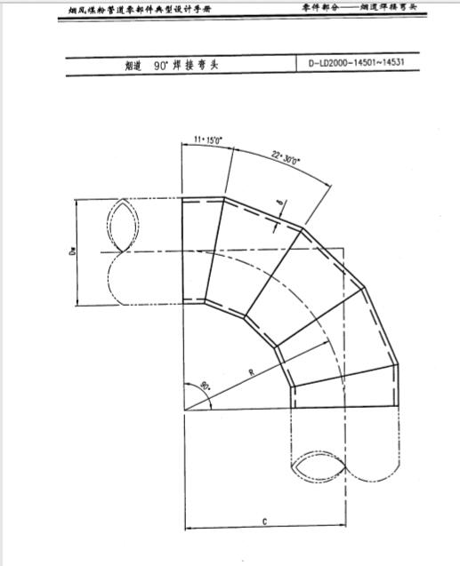 這樣的一個拼接過程里邊,它是由以下的這幾個角度來拼成的,咱說的是90度的,首先它的兩端是11.5度,這樣的一個度數(shù)的部位。中間三個環(huán)節(jié)都是22.5度。等于是22.5度×3。得出來的是67.5度。兩端的兩個11.25度×2。是22.5度。67.5度加22.5度。正好一個直角90度的一個拼接彎頭產(chǎn)品就出現(xiàn)了。在這樣的一個規(guī)范里邊,是有一個斷節(jié)下料樣板展開圖,還有管子下料圖。包括焊縫的尺寸。也都是有著相應(yīng)的規(guī)定。